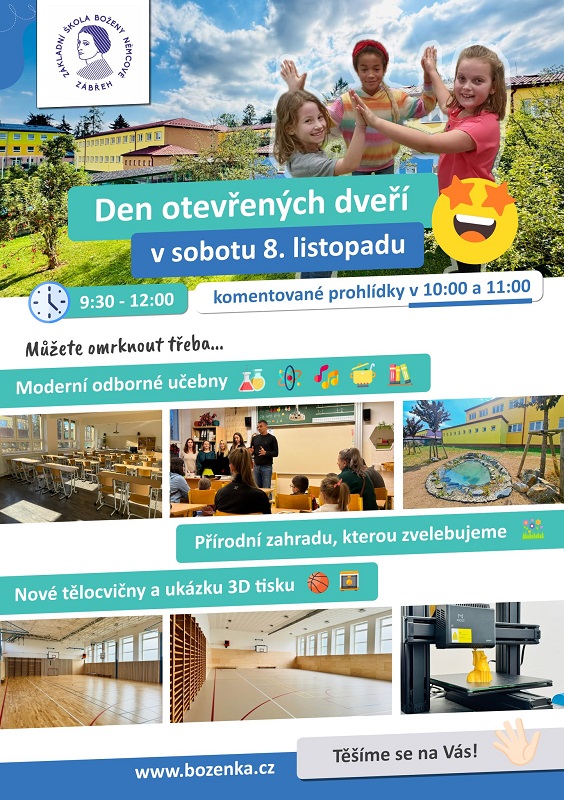 Základní škola Zábřeh, Boženy Němcové srdečně zve všechny zájemce na Den otevřených dveří, který se koná v sobotu 8. listopadu 2025 od 9:30 do 12:00 hodin. V 10:00 a v 11:00 hodin budou probíhat komentované prohlídky. Návštěvníci uvidí nové moderní učebny, tělocvičny a přírodní zahradu. Nebude chybět ani ukázka 3D tisku.