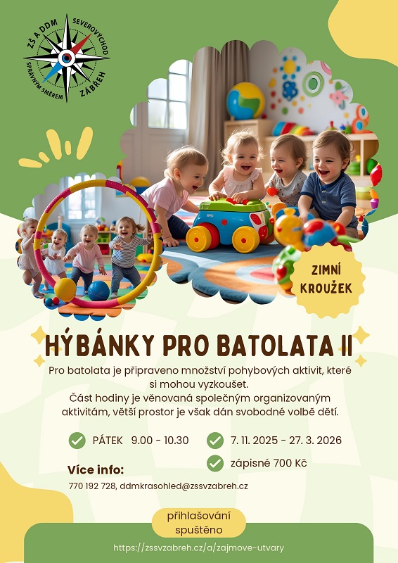 Základní škola a Dům dětí a mládeže Krasohled Zábřeh otevírá v termínu 7. 11. 2025 – 27. 3. 2026 zimní kroužek „Hýbánky pro batolata II“. Kroužek se uskuteční každý pátek od 9:00 do 10:30 hodin.