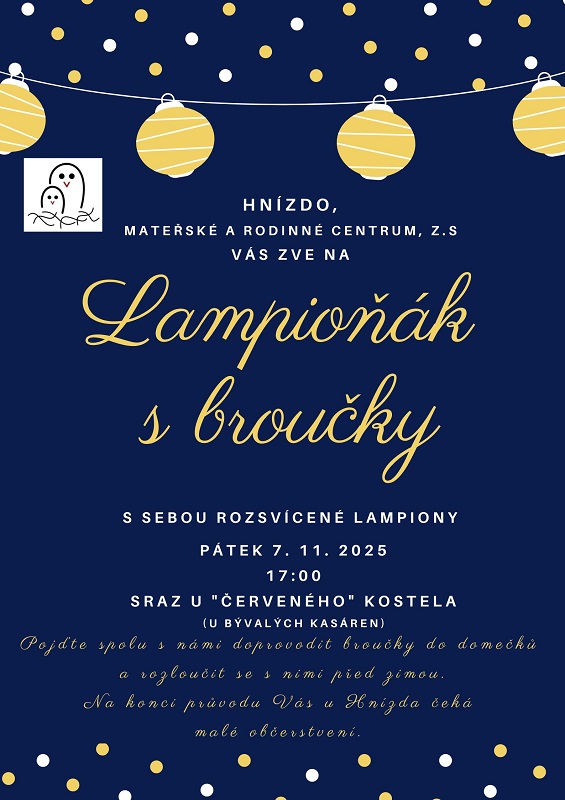 Hnízdo, mateřské a rodinné centrum z.s. vás zve na akci Lampioňák s broučky, která se koná v pátek 7. listopadu od 17:00 hodin. Sraz je u „červeného“ kostela (Husův sbor) u bývalých kasáren. Na konci průvodu bude u klubovny Hnízda na Masarykově náměstí na účastníky čekat malé občerstvení.
