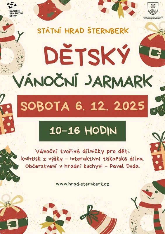 Oblíbenou adventní akcí na hradě Šternberk je tradiční Dětský vánoční jarmark, který se uskuteční v sobotu 6. prosince 2025 od 10:00 do 16:00 hodin. Hodovní sál hradu zaplní tvořivé dílničky pro děti i rodiče zaměřené na výrobu vánočních ozdob a dekorací. Návštěvníci si mohou vyrobit např. vánoční svícny či gelové svíčky, vyzkoušet si malování na sklo, zdobení perníčků, výrobu mýdel a mnoho dalších aktivit. Vstupné na jarmark činí 60 Kč, jednotlivé dílničky si dětí hradí samostatně. Po celý den budou probíhat také vánoční prohlídky, které je možné v rámci návštěvy hradu absolvovat. Občerstvení v hradní kuchyni zajišťuje Pavel Duda. Tvořivé aktivity doplní netradiční tiskařská dílna Knihtisk z výšky. Dílnu povede pan Roman Prokeš, principál studia Bez kliky, herec, loutkař, tiskař a výřečník. Zábavnou formou seznámí návštěvníky s historií, ukáže a vysvětlí techniku tisku a každý návštěvník bude mít příležitost natisknout si vlastní upomínkovou kartu. Tiskařská dílna bude v rámci vstupného na jarmark přístupná zdarma. Program ve vnitřních prostorách hradu doplní dřevěný betlém v životní velikosti instalovaný na dolním nádvoří.