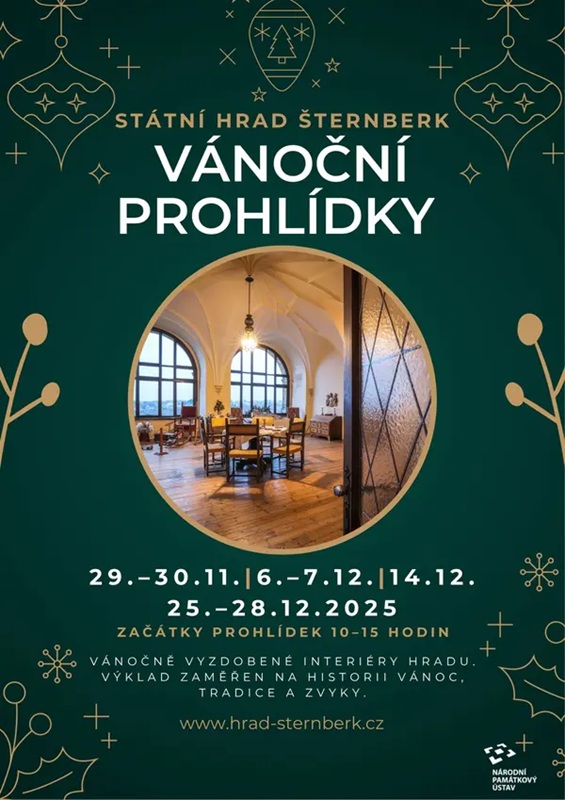 Na adventní víkendy připravuje Státní hrad Šternberk tradiční Vánoční prohlídky. V rámci prohlídek návštěvníci uslyší zajímavé informace o historii Vánoc, vánočních tradicích a zvycích, jak slavila Vánoce šlechta i prostý lid. Interiéry hradu zpestří slavnostní vánoční výzdoba, betlémy, historické hračky a mnoho dalších vánočních doplňků. Hrad Šternberk bude otevřen o víkendech 29. 11.–30. 11. / 6.-7. 12. / 13.-14. 12. 2025 a rovněž o svátcích vánočních ve dnech 25.–28. 12. 2025, vždy od 10:00 do 15:00 hodin.