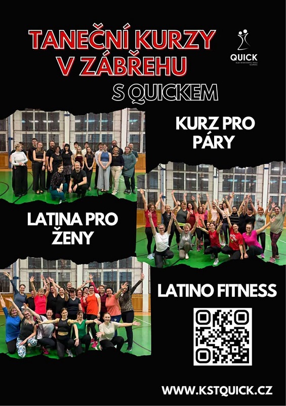 Klub sportovního tance QUICK Olomouc, z. s., s pobočkou v Zábřehu, pořádá v lednu 2026 nové taneční kurzy pro páry a také kurzy latino a latino fitness určené ženám. Výuka probíhá v prostorné tělocvičně SŠ, ZŠ, MŠ a Dětského domova na ulici Sušilova 40 v Zábřehu.