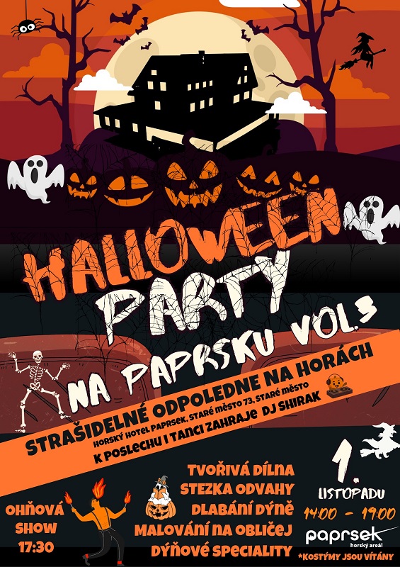 V horském hotelu Paprsek ve Starém Městě se v sobotu 1. listopadu od 14:00 do 19:00 hodin uskuteční další ročník oblíbeného strašidelného odpoledne s halloweenskou tematikou. Návštěvníci se mohou těšit na tvořivé dílny, dlabání dýní, malování na obličej i stezku odvahy. Program doplní dýňové speciality, ohňová show a večerní hudební set DJ Shiraka. Kostýmy jsou vítány.