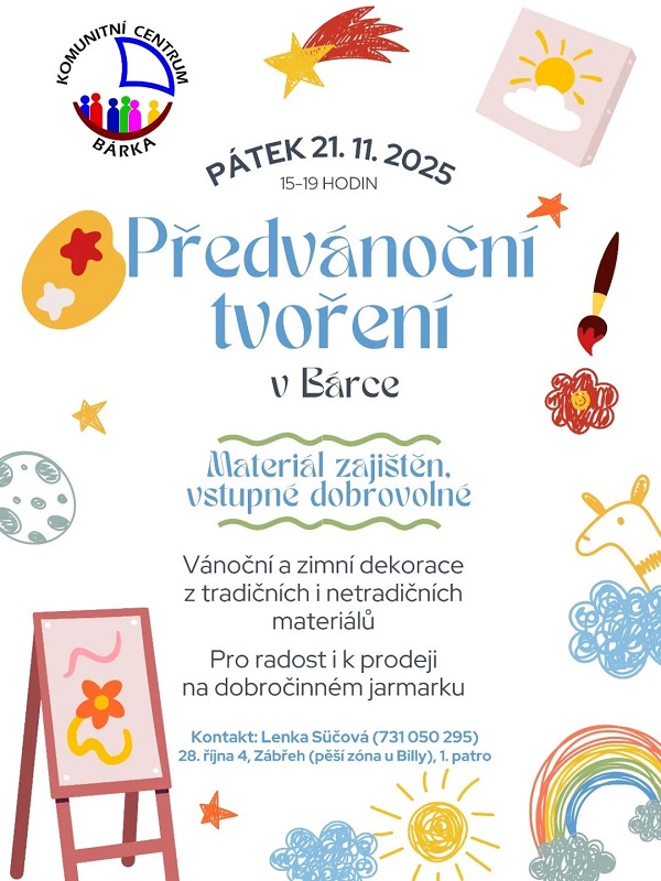 Komunitní centrum Bárka zve na Předvánoční tvoření vánočních a zimních dekorací, které se uskuteční v pátek 21. listopadu od 15:00 do 19:00 hodin v Bárce (28. října 4, Zábřeh – pěší zóna u Billy). Materiál je zajištěn. Vstupné je dobrovolné.