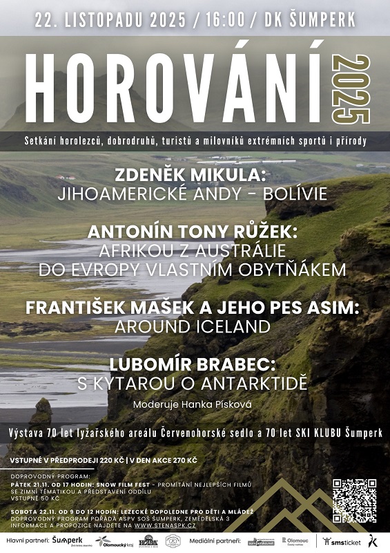 V Šumperku se uskuteční 32. ročník festivalu Horování, tradičního setkání horolezců, dobrodruhů, turistů a příznivců extrémních sportů i přírody. Mezi hosty letošního ročníku budou Lubomír Brabec, který představí své zážitky z Antarktidy a připraví koncert, Antonín Tony Růžek s cestou po Africe, František Mašek s příběhy z Islandu a Zdeněk Mikula, který se podělí o zkušenosti z Bolívie. Vstupenky jsou k dispozici online na smsticket.cz a také na pokladně Domu Kultury Šumperk.