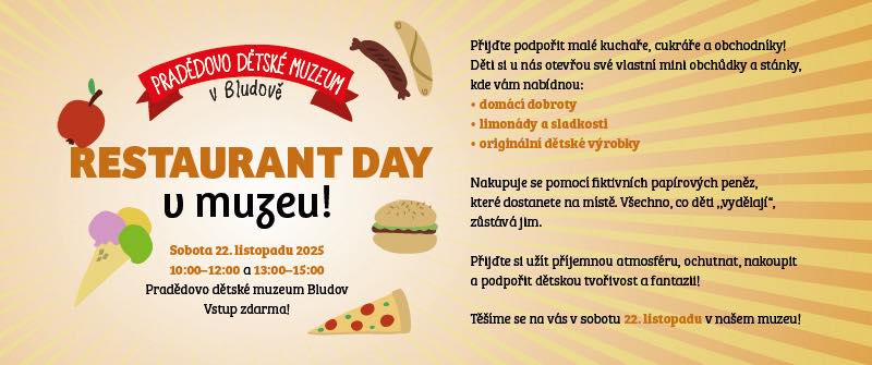 V sobotu 22. listopadu se herna v Pradědově dětském muzeum v Bludově zaplní malými obchůdky, kde si děti vyzkouší roli obchodníků. Nabízet budou vlastní dobroty, limonády i rukodělné výrobky a veškerý výdělek jim zůstane. Nákup bude umožněn pomocí papírových peněz dostupných na místě. Na akci je vstup zdarma. Restaurant Day probíhá od 10:00 do 12:00 a od 13:00 do 15:00 hodin. Návštěva akce vyžaduje předchozí rezervaci na www.pradedovomuzeum.cz – je třeba zvolit vstupenku za 1 Kč s platbou na místě, skutečné vstupné se však neúčtuje.