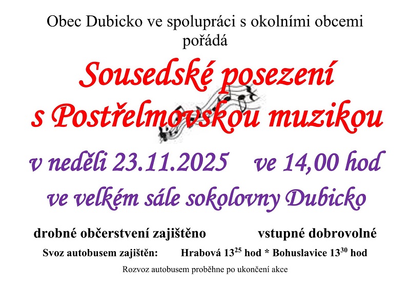 Obec Dubicko ve spolupráci s okolními obcemi pořádá ve velkém sále místní sokolovny v neděli 23. listopadu od 14:00 hodin Sousedské posezení s Postřelmovskou muzikou. Drobné občerstvení je zajištěno. Vstupné je dobrovolné.
