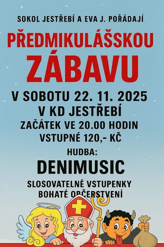 Sokol Jestřebí a Eva J. pořádají v sobotu 22. listopadu od 20:00 hodin v KD Jestřebí Předmikulášskou zábavu. Vstupné je 120 Kč. K poslechu zahraje Denimusic. Bohaté občerstvení bude zajištěno.