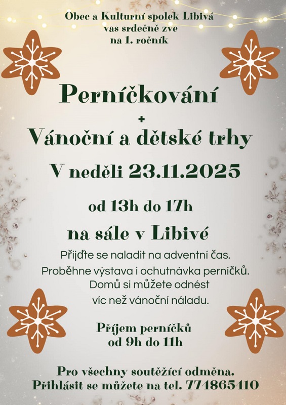 Obec a Kulturní spolek Libová vás srdečně zve na 1. ročník Perníčkování a vánočních i dětských trhů. Akce se koná v neděli 23. listopadu od 13:00 do 17:00 hodin na sále v Libivé. Na výstavě proběhne i ochutnávka perníčků.