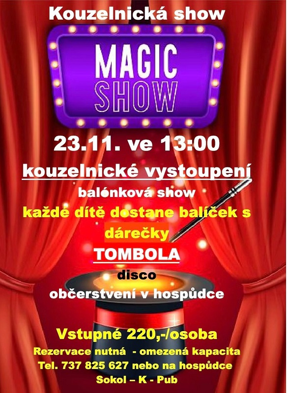 V hospůdce Sokol -K- Pub v areálu zábřežské sokolovny se v neděli 23. listopadu od 13:00 hodin uskuteční kouzelnická show. Vstupné je 220 Kč za osobu. Kvůli omezené kapacitě je nutné si na akci zarezervovat místo na telefonním čísle 737 825 627. Malí návštěvníci se mohou těšit na balónkovou show, tombolu i občerstvení. Každé dítě obdrží balíček s dárečky.