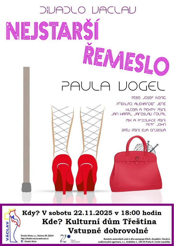 V sobotu 22. listopadu od 18:00 hodin se v kulturním domě v Třeštině představí Divadlo Václav s divadelní hrou Nejstarší řemeslo. Vstupné je dobrovolné.