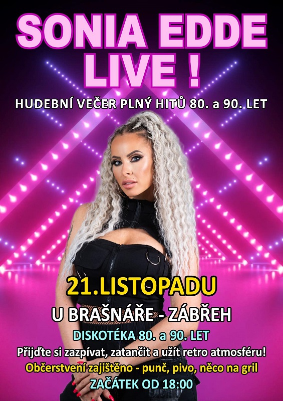 Punč U Brašnáře Zábřeh vás srdečně zve v pátek 21. listopadu od 18:00 hodin na hudební večer plný hitů 80. a 90. let, který bude moderovat Sonia Edde z rádia Kiss. Občerstvení je zajištěno.