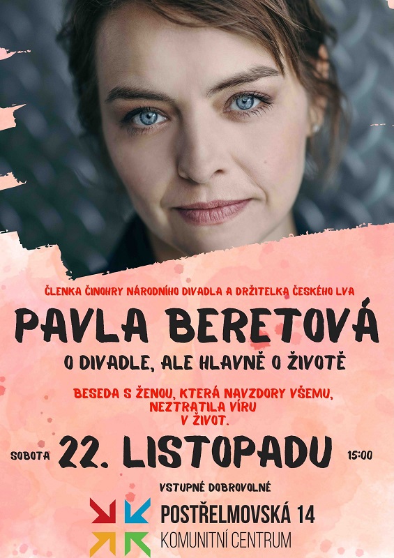Komunitní centrum Postřelmovská 14, Zábřeh vás srdečně zve v sobotu 22. listopadu od 15:00 hodin na setkání s herečkou Pavlou Beretovou, členkou činohry Národního divadla, výraznou osobností českého divadla a filmu. Díky tomu, že přijala pozvání do Komunitního centra Postřelmovská 14, budou moci návštěvníci nahlédnout nejen do problematiky divadelního nebo filmového světa, ale i do jejího osobního života. Není tajemstvím, že se musela vyrovnávat s brzkou ztrátou obou rodičů a sestry. Jak sama přiznává, právě tato zkušenost ji silně ovlivnila při ztvárnění hlavní role filmu Rok vdovy, za kterou získala cenu české filmové kritiky a cenu Českého lva za rok 2024. Herečka bude hledat odpovědi na otázky, se kterými jsme konfrontováni v různých podobách i my. Vstupné je dobrovolné.