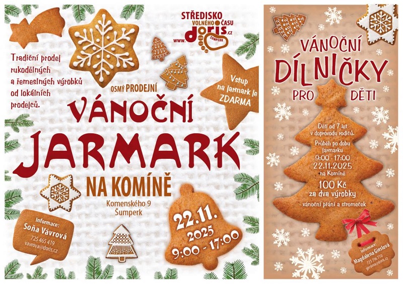 V sobotu 22. listopadu se v Šumperku uskuteční osmý prodejní vánoční jarmark s pestrou nabídkou výrobků od místních řemeslníků a prodejců. Akce se v budově Komína (Komenského 9, Šumperk) od 9:00 do 17:00 hodin. Na jarmarku bude možné obdivovat a zakoupit například svíčky, přírodní kosmetiku, vánoční ozdoby, oblečení, kabelky, šperky, keramiku a další zajímavé výrobky. Součástí programu bude i občerstvení v podobě kávy a pečiva. Pro děti jsou připraveny tvořivé dílny, malé děti do 7 let se mohou dílny účastnit v doprovodu rodičů.