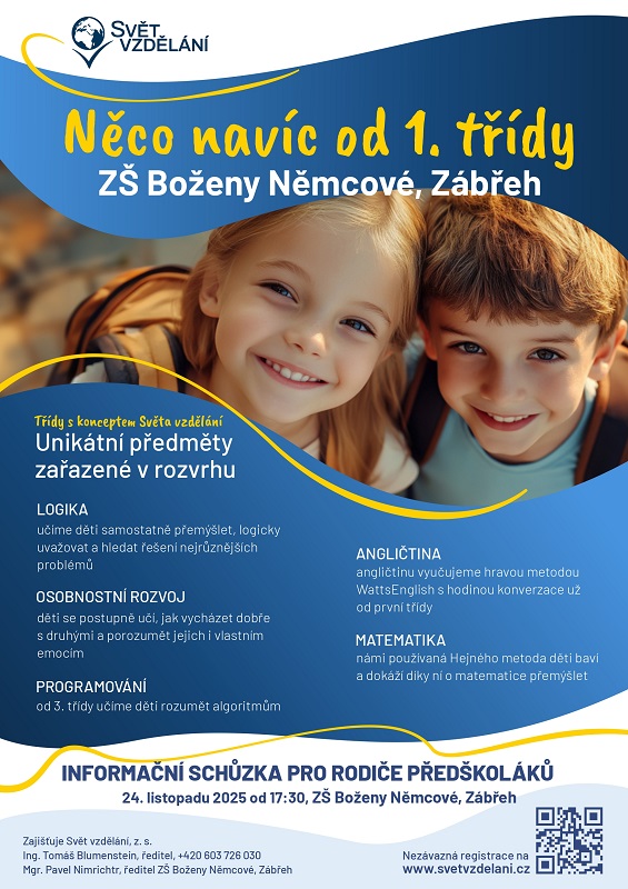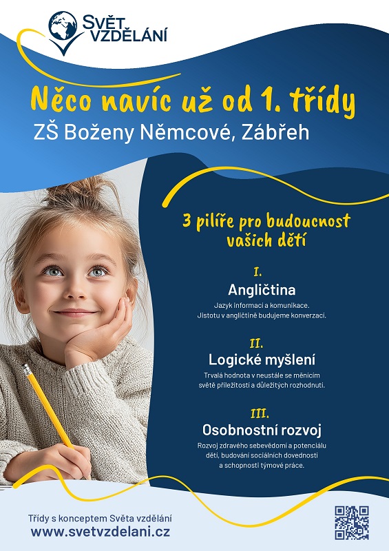 Pro příští školní rok 2026/2027 se na Základní škole Zábřeh, Boženy Němcové otevírá třída Světa vzdělání. Informativní schůzka pro rodiče předškoláků se ve škole uskuteční v pondělí 24. listopadu 2025 od 17:30 hodin.