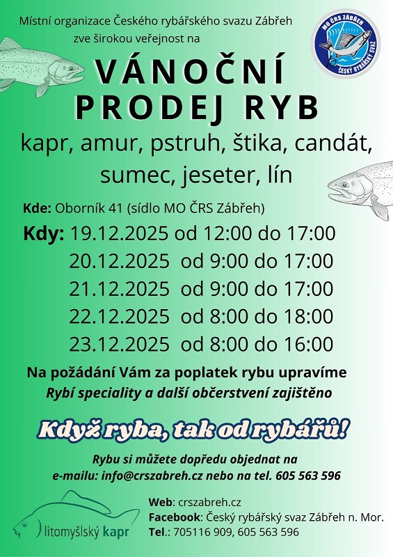 Místní organizace Českého rybářského svazu Zábřeh zve širokou veřejnost na vánoční prodej ryb, který se uskuteční ve dnech 19.–23. prosince 2025 v areálu sídla MO ČRS Zábřeh na adrese Oborník 41. V nabídce budou kapr, amur, pstruh, štika, candát, sumec, jeseter a lín. Na požádání je možné rybu za poplatek upravit. Rybu si můžete dopředu objednat na e-mailu: info@crszabreh.cz nebo na telefonu 605 563 596.