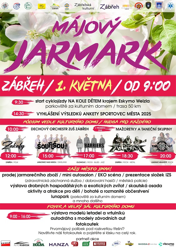 V pátek 1. května od 9:00 hodin ožije okolí kulturního domu v Zábřeze tradičním Májovým jarmarkem s nabídkou stánků, řemesel, regionálních specialit, hudby i bohatého doprovodného programu pro rodiny s dětmi. Součástí dne bude také cyklojízda Na kole dětem krajem Eskymo Welzla a vyhlášení výsledků ankety Sportovec města 2025.